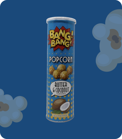 - Popcorn – Corn, Sugar, Dextrose Syrup, Coconut Cream Powder (10%), Salted Butter (6%) (Butter (Milk), Salt) Palm Oil, Salt Raising Agent : Sodium Carbonates ; Flavouring, Colour : Plain Caramel, Emulsifier : Soya Lecithin
