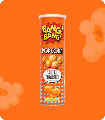 - Popcorn – Bang Bang Popcorn Salted Caramel Flavour: Corn, Sugar, Dextrose, Glucose Syrup,Salted Butter (Butter(Milk), Salt), Palm Oil, Salt (0,5%), Raising Agent : Sodium Carbonates ; Flavouring, Colour : Plain Caramel, Emulsifier : Soya Lecithin